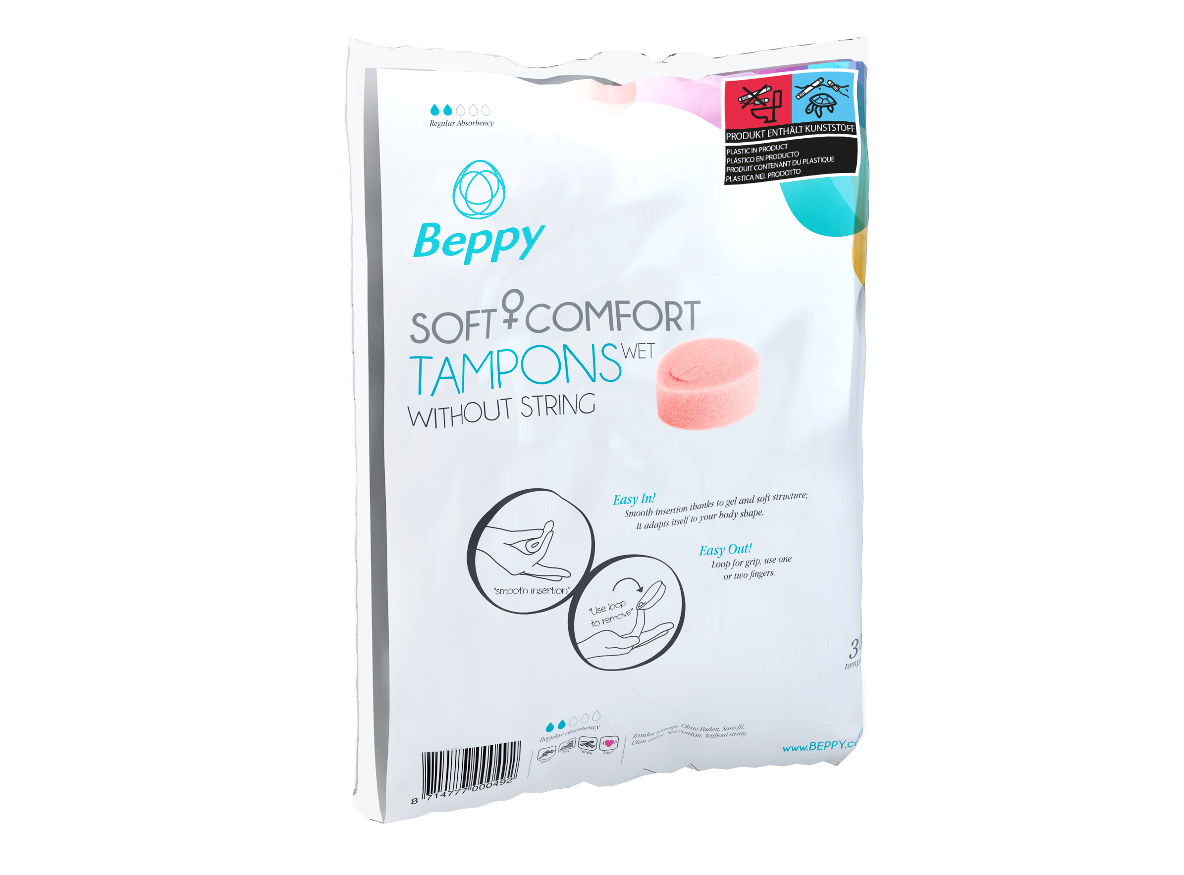 The Beppy Soft+Comfort Tampon WET is a soft flexible sponge. The tampon offers extra comfort and always fits well because the soft structure of the tampon assumes the shape of the body. The Beppy WET variant has lacta gel, making the tampon easy to insert.